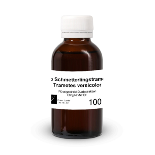 Die Schmetterlingstramete-Pilze werden auf zertifizierten Rohstoffen, die zu 100 % aus der Bio-Landwirtschaft stammen, angebaut und nach der Ernte schonend getrocknet, um die Inhaltstoffe möglichst weitgehend zu erhalten. Im nächsten Schritt erfolgt die alkoholische Extraktion. Als Extraktionsmittel verwenden wir nur reines Bio-Ethanol, gebrannt aus biologisch angebautem Getreide. Dieser Extraktionsschritt dauert mehrere Tage während dieser sich die alkohollöslichen Inhaltsstoffe aus den Pilzen lösen, danach werden die Pilze abgefiltert und für den nächsten Extraktionsschritt vorbereitet. Der Alkohol aus dem Extrakt wird durch Destillation verdampft, damit das Endprodukt alkoholfrei ist. Im nächsten Schritt werden die verbliebenen Pilze mit Wasser extrahiert, bei diesem Prozess werden die wasserlöslichen Stoffe aus dem Pilzmaterial gelöst. Am Ende des Produktionsprozesses werden die beiden Extrakte vereint und mit pflanzlichem Bio-Glycerin aus Sonnenblumenkernen homogenisiert. Glycerin ist ein vollständig körperfreundlicher Stoff, der die Vitamin- und Mineralstoffmoleküle umschließt und verhindert, dass Qualitätsmängel die Inhaltsstoffe während der Lagerung beeinträchtigen. Außerdem unterstützt Glycerin die Resorption, so dass wertvolle Inhaltsstoffe auch bei Darmproblemen resorbiert werden können und es verleiht dem Flüssigextrakt einen angenehmen Geschmack.
